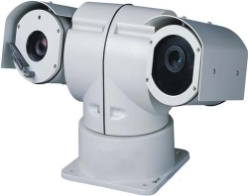 集成了紅外熱像儀,彩色攝像機,可同時輸出兩路視頻,具有熱像儀超溫檢測功能,白天熱成像檢測到高溫目標,同時可見光攝像機檢測到火源時,云臺停止巡航,并向遠程監控主機發送報警信息,報警信息包括:機器ID,云臺水平和俯仰角度,超溫區域的坐標(左上角和右下角)。夜間由于環境干擾較少只需要熱成像檢測到超溫目標即可認定有火情。