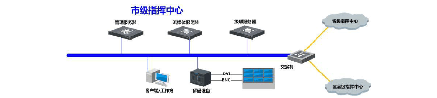 省級指揮中心部署視頻監控平臺軟件,通過專網線路連接國家林業指揮中心、市級指揮中心和部分其他單位。市級指揮中心通過專網線路分別和省指揮中心以及區縣級指揮中心連接,市級指揮中心部署視頻監控平臺軟件,實現和省級及區縣級的平臺進行聯網。區縣級指揮中心通過專網線路連接市級指揮中心,同時部署視頻監控平臺軟件和市級平臺進行聯網。前端系統通過光纖線路連接到區縣級指揮中心,無法通過光纖線路連接的前端系統,通過微波方式連接到區縣級指揮中心。