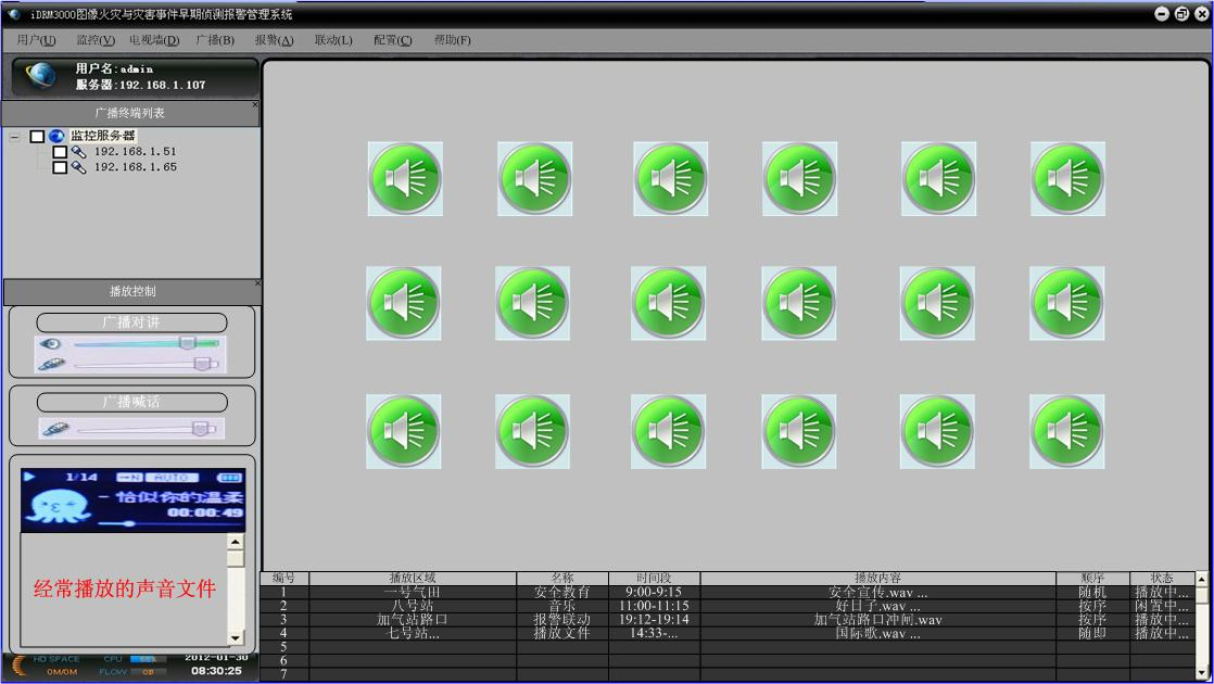 廣播指揮客戶端在日常情況下能過播放聲音文件,宣傳變電站安全制度,在報警的情況下,立即聯動報警聲音進行疏散和制止,同時指揮人員在監控中心配合圖像監控,能夠實時喊話指揮前端進行救災。