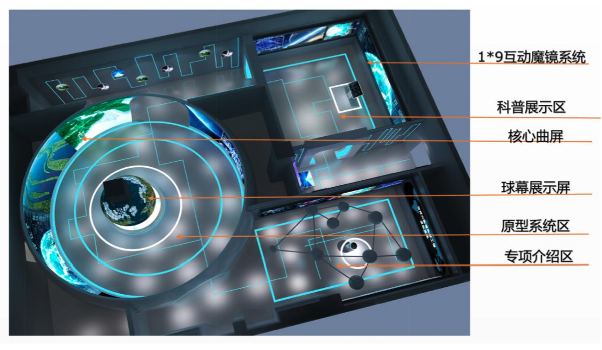 現要求結合2D展廳情況、專項的設備要求與地球大數據的特點,建設一個具有一定震撼力的、具備自然交互與智能分析功能的展示環境,滿足原型系統的展示要求,同時需具備承載我院更多重要項目與重要數據的能力,在未來擬建設成為我院重要大數據展示平臺。