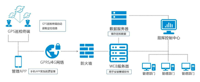 系統由GPS智能終端和系統管理平臺利用4G網絡組成一個實時巡檢管理系統。巡檢人員在巡檢時攜帶手持式的GPS智能終端,按巡檢方式不同可設置自動向管理中心通過4G網絡發送位置信息,若發現某片區發生故障可以記錄在GPS智能終端內,并可經4G網絡傳回系統管理平臺,在需要檢查附屬設施處,工作狀態和運行參數也可以同樣的方式傳回系統管理平臺。系統管理平臺會對人員的位置信息,安全故障,設施的狀態和參數自動統計,分析合評估,并生成各類統計分析報表,通過巡檢到位報表了解巡檢人 員的巡檢軌跡和巡檢到位情況;通過安全故障和設施狀態、參數等數據類報表可掌握、分析設施運行情況,缺陷分析。