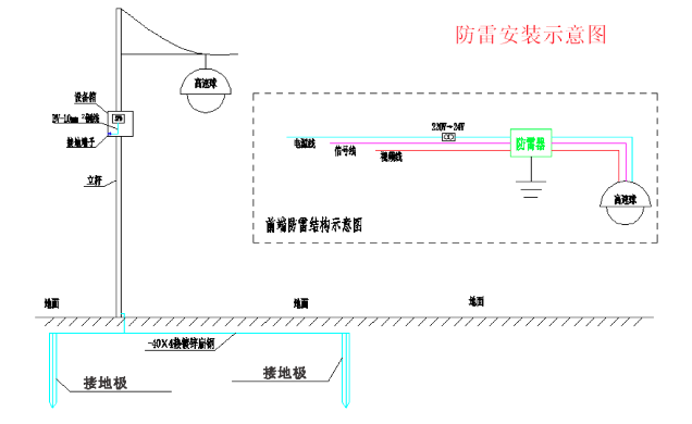 室外雷擊途徑主要有:沿電源線路、視頻線路、控制線路侵入的雷擊和過電壓,可能會危及攝像機,當金屬立桿遭遇直擊雷襲擊時,其金屬桿體往下泄流的瞬間會對其內部的信號線路產生比較強烈的干擾。所以本次項目所在地室外攝像機立桿應做以防雷接地裝置。