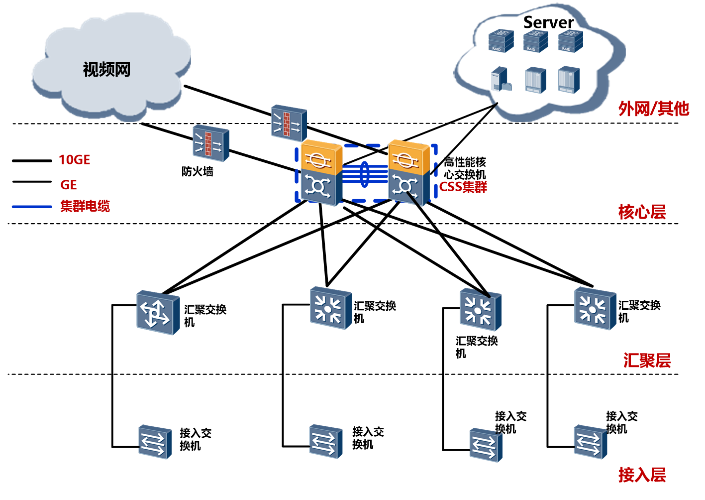 視頻網(wǎng)核心層在視頻機(jī)房配置一臺(tái)高性能交換機(jī),互為主備,作為視頻網(wǎng)的核心交換機(jī)。上行通過專用網(wǎng)絡(luò)鏈接上級(jí)管理單位的視頻網(wǎng),下行通過萬兆光纖鏈接至匯聚交換機(jī);