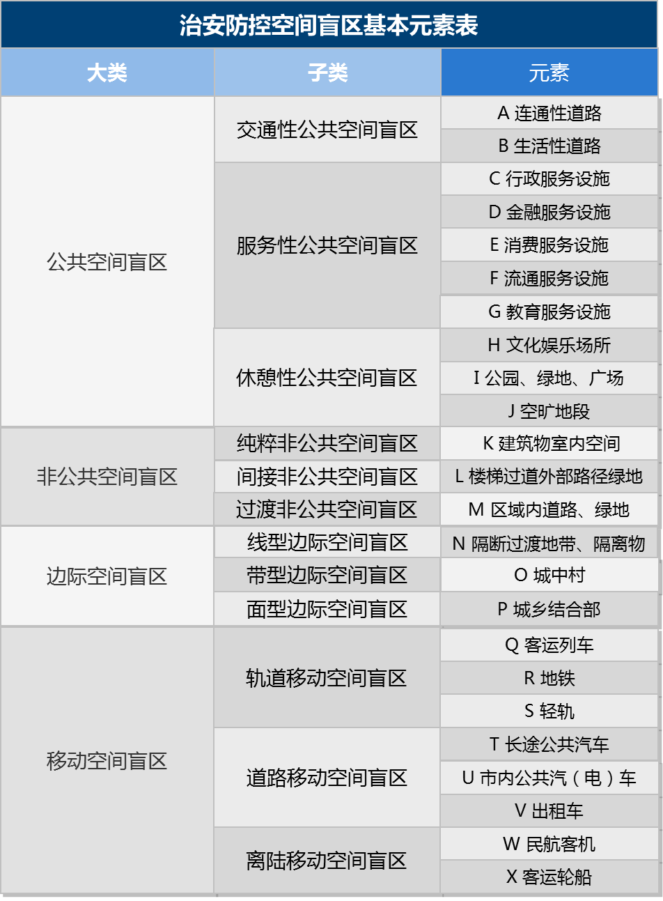公共空間盲區(qū)是指由于空間結(jié)構(gòu)的復(fù)雜性、人員流動(dòng)的復(fù)雜性或者公共防控體系設(shè)計(jì)上的缺陷等原因,在公共空間中產(chǎn)生的不易被公共或個(gè)體防控的空間。公共空間具有不確定性,隨著經(jīng)濟(jì)、社會(huì)的發(fā)展,其特征和分布格局也在發(fā)生著變化,原來容易察覺到,隱蔽程度較低的空間盲區(qū),會(huì)發(fā)展成不易察覺的、隱蔽程度高的空間盲區(qū),原來致盲因素不明顯的公共空間,會(huì)逐漸成為空間盲區(qū)。