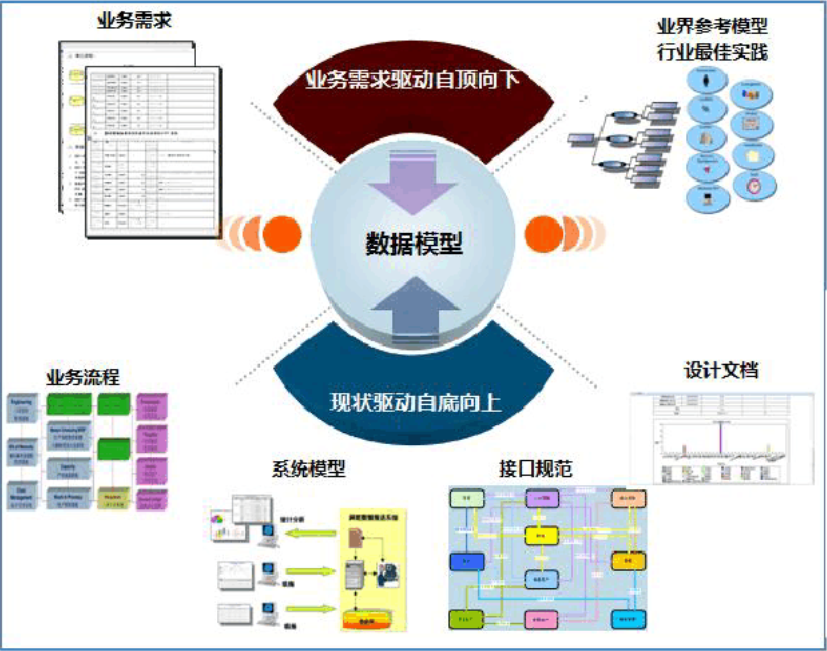 企業(yè)級數(shù)據(jù)模型設(shè)計可采用“業(yè)務(wù)需求驅(qū)動自頂向下”和“基于現(xiàn)狀驅(qū)動自底向上”相結(jié)合模式,參照業(yè)界參考模型、行業(yè)最佳實踐,共同形成數(shù)據(jù)模型。從業(yè)務(wù)需求驅(qū)動入手自頂向下,參照業(yè)界參考模型、行業(yè)最佳實踐搭建數(shù)據(jù)模型整體框架,通過現(xiàn)狀調(diào)研獲取企業(yè)內(nèi)部業(yè)務(wù)流程、設(shè)計文檔、系統(tǒng)模型、接口規(guī)范等現(xiàn)狀信息,現(xiàn)狀驅(qū)動自底向上,細化和完善數(shù)據(jù)模型的設(shè)計。