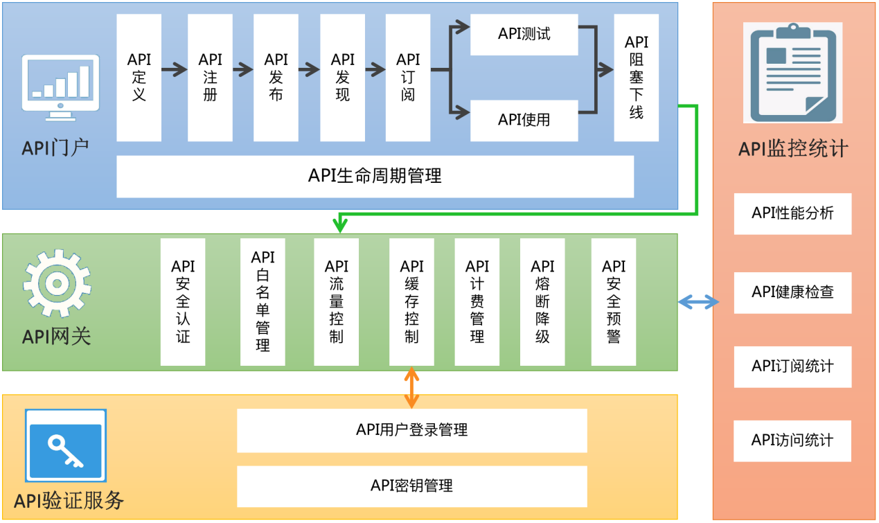 結(jié)合本項目需求和數(shù)據(jù)安全原則,規(guī)范微服務(wù)開發(fā)的業(yè)務(wù)流程,API門戶提供開放、阻塞、廢棄、銷毀等全生命周期管理功能;API網(wǎng)關(guān)提供整套安全防護手段,包括安全認(rèn)證、流量控制、防惡意攻擊、API調(diào)用質(zhì)量分析等功能,控制API的測試與使用;API驗證服務(wù)為框架提供API用戶登錄管理和密鑰管理支持;API監(jiān)控通過API網(wǎng)關(guān)提供訂閱、統(tǒng)計功能。