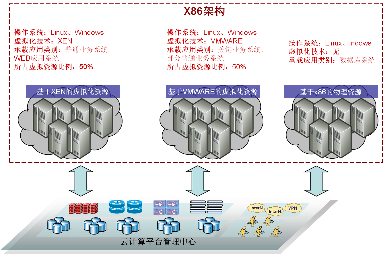 云基礎(chǔ)服務(wù)(IaaS):在充分利用既有投資的基礎(chǔ)上,利用云計算池化技術(shù),建設(shè)計算池、存儲池、網(wǎng)絡(luò)池、容災(zāi)池,根據(jù)應(yīng)用情況隨需拓展,實現(xiàn)動態(tài)拓展、按需分配,資源共享。
