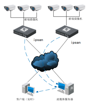 當多個客戶端需要同時查看某監控點的相同畫面時,勢必會造成在一條通訊網絡線路上的數據擁堵,嚴重浪費網絡資源。監控平臺軟件可以在有限的帶寬下,通過高效的流媒體轉發和流媒體級聯功能,保證音視頻流穩定有效的傳輸,以及在不 同網段之間轉發媒體數據,實現被轉發媒體位置的透明性。當有多個客戶端需要同時訪問同一遠程畫面時,在轉發服務與前端視頻通道之間只占用一個通道帶寬的網絡資源,再由轉發服務器將數據分發給多個客戶端,解決了帶寬、內外網和多用戶訪問的沖突,有效地利用 網絡帶寬。流媒體服務器支持視音頻流的轉發,當有多個局域網客戶端需要同時訪問同一遠程畫面時,可以通過流媒體服務器進行轉發,在轉發服務與前端視頻通道之間只占用一個通道帶寬的網絡資源,再由轉發服務器將數據分發給多個客戶端。