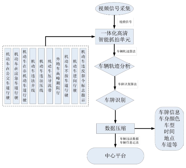 系統(tǒng)利用車輛視頻檢測、車輛軌跡分析處理等先進技術(shù),對監(jiān)管路段的過往車輛進行全天候?qū)崟r監(jiān)管并記錄相關(guān)圖像數(shù)據(jù)。系統(tǒng)采用400萬高清智能抓拍一體機為圖像采集設(shè)備,通過內(nèi)置DSP處理模塊完成視頻檢測、抓拍、識別等全過程,動態(tài)獲取路口的實時高清圖像。
