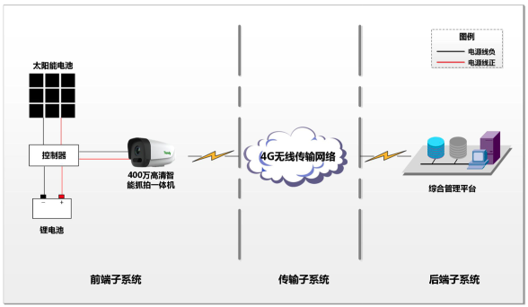 太陽能電子警察系統(tǒng)由前端子系統(tǒng)、傳輸子系統(tǒng)以及后端子系統(tǒng)組成,采用分層結(jié)構(gòu)設(shè)計。通過4G無線傳輸網(wǎng)絡(luò)實現(xiàn)前端子系統(tǒng)與后端子系統(tǒng)之間的互聯(lián)互通。
