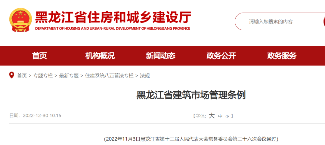 2022年11月3日黑龍江省第十三屆人民代表大會常務(wù)委員會第三十六次會議通過,《黑龍江省建筑市場管理條例》自2023年1月1日起施行。