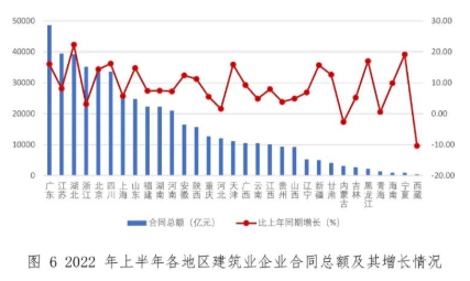 2022 年上半年,廣東、江蘇、湖北、浙江、北京、四川6個地區建筑業企業簽訂合同總額均超過30000億元,分別達到48601.5億元 39419.9億元 392092億元 351917億元、35082.3億元和33563.3億元。