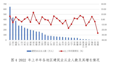 2022年上半年,全國建筑業從業人數超過百萬的地區仍然是13個。江蘇、浙江依然是從業人數大省,人數分別達到647.1萬人和437.9萬人。
