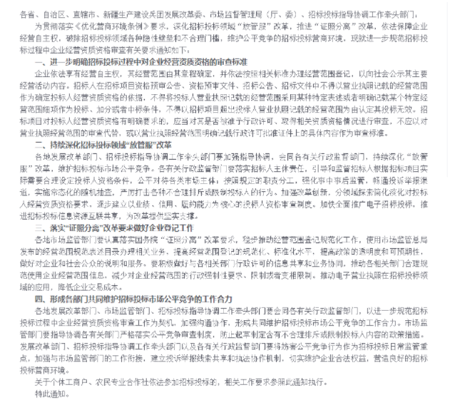 以前招標方以營業執照記載的經營范圍為理由排斥其他投標人,可能還屬于打了擦邊球,被排斥的投標人有口也說不出啥。而此次發改委的政策通知一出,就相當于官宣了,以后招標方就不能再這樣操作了?。?!