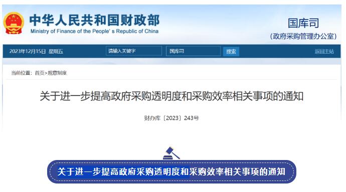 12月14日,財(cái)政部發(fā)布《關(guān)于進(jìn)一步提高政府采購(gòu)?fù)该鞫群筒少?gòu)效率相關(guān)事項(xiàng)的通知》(財(cái)辦庫(kù)〔2023〕243號(hào)),本通知自印發(fā)之日起施行。明確: